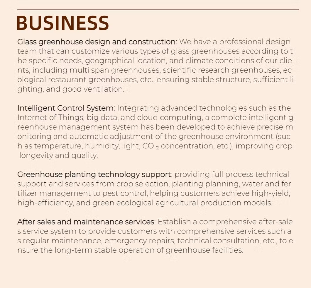 La compañía introduce continuamente tecnologías y equipos avanzados de invernadero de fuentes nacionales y extranjeras, e innova y optimiza en base a las condiciones locales. Nuestro invernadero de película multicéntrico adopta un marco de aleación de aluminio de alta resistencia y material de película de alta calidad, que tiene buena transparencia, aislamiento y resistencia al viento. Mientras tanto, equipado con sistemas avanzados de ventilación, riego, sombreado y otros, proporciona un ambiente ideal para el crecimiento de los cultivos.